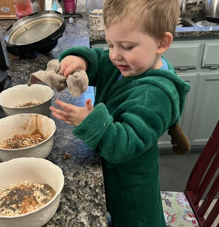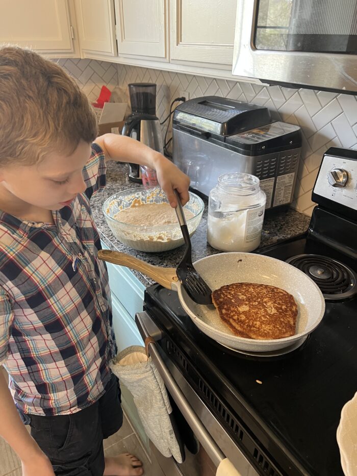 My son Maverick (age 5) has been helping me in the kitchen since he was about one. Just this past week, I started teaching him how to make his own eggs on the stove. He did about 95% of it himself while I instructed. The second time, I stayed nearby while he led the steps. In another week or so, he’ll likely be able to make his own eggs start to finish.