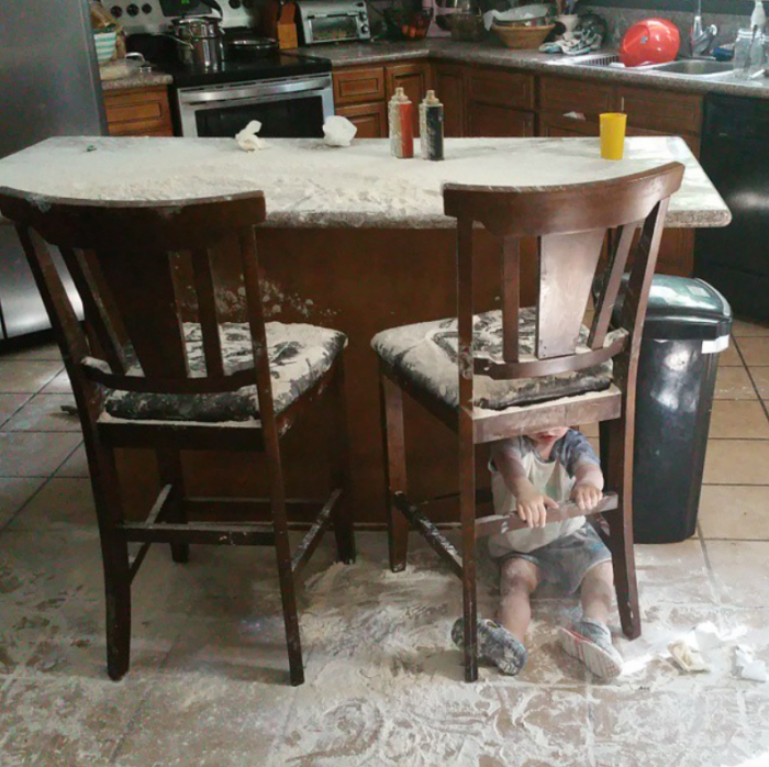 The boys were deliriously happy, covered head to toe in white powder. The dining room was coated. The kitchen counters were coated. The floor looked like it had snowed indoors overnight.